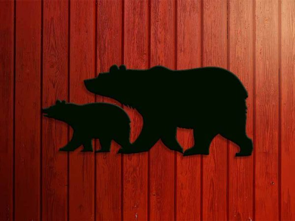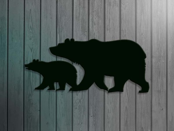 Detaljrikt figurskuret motiv av en björn hona och hennes unge. Tillverkas stålplåt eller rostfri plåt som pulverlackeras svart. Plåttjocklek 2mm.