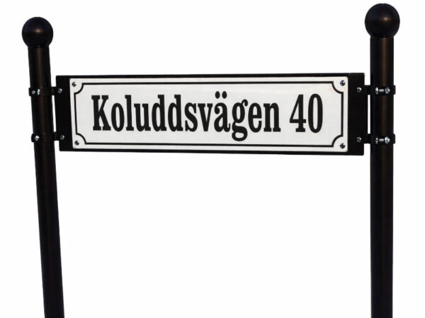 Emaljerad gatuskylt med en passande stolphållare. Skylten sitter monterad mellan dom dekorativa stolparna.
