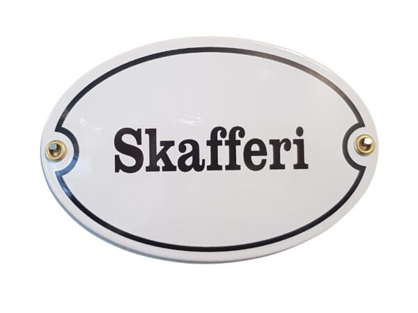 Klassisk emaljskylt med texten Skafferi i svart på vit botten. Den kupade formen och den äkta emaljen ger skylten en tidlös känsla och vacker karaktär i köket.