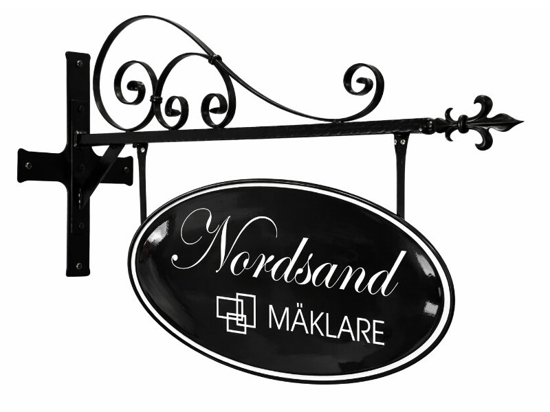 Gatuskylt i flera storlekar monterad på dekorativ smidesstolpe 240cm.