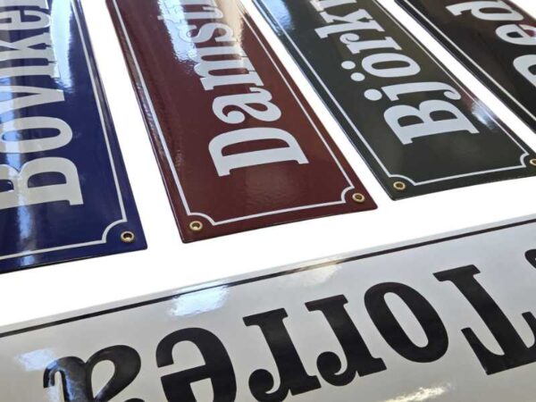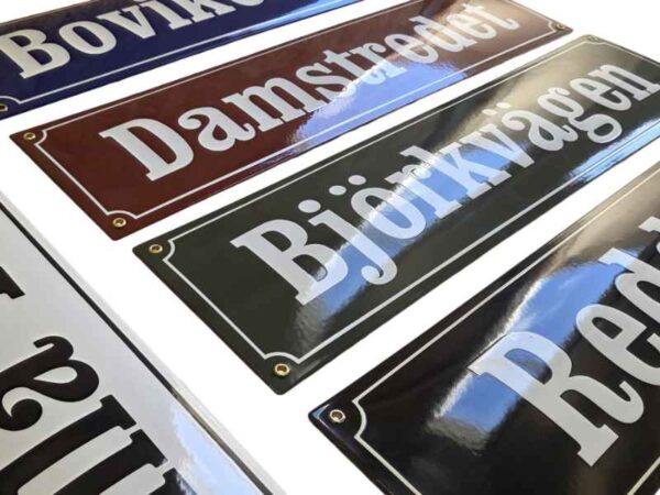 Emalj är en glasliknande beläggning som har förenats med stålplåt under bränning i hög temperatur. Med sin klassiska utformning är den emaljerade skylten oerhört vacker att se på. Emaljskylten har en hög glansig yta och är smutsavvisande, reptålig, hygienisk och även temperaturbeständig.