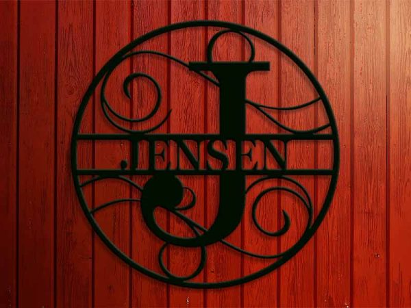 Personligt och detaljrikt figurskuret monogram bokstav J i en rund snygg ram som ni anpassar med ert namn eller text.