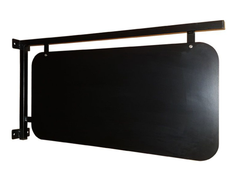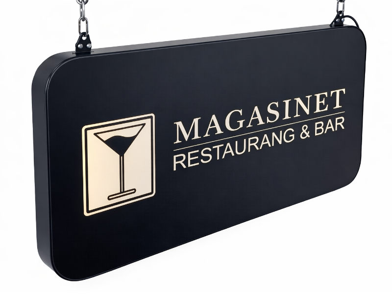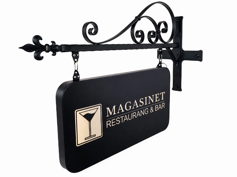 Rejäl smidesskylt för stadsmiljö i gammaldags stil med skylt i fasta stag.