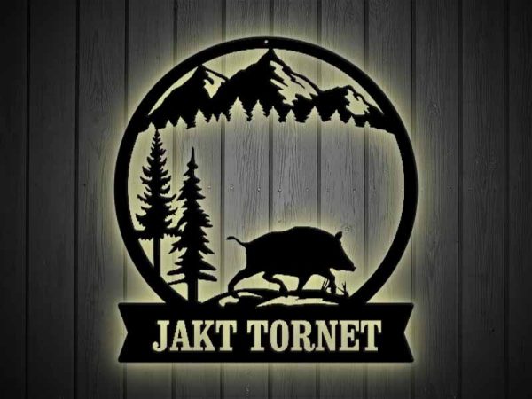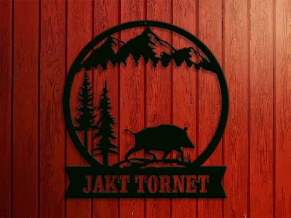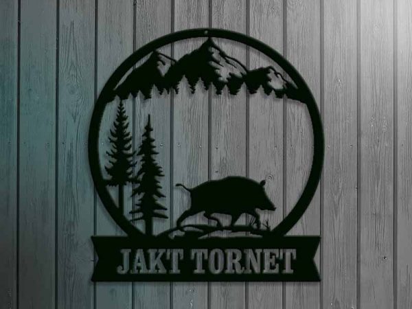 Detaljrik personlig smidestavla med naturmotiv innehållande berg ,träd och ett springande vildsvin.