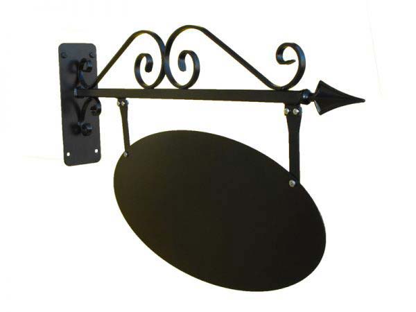 Smidesskylt i gammaldags stil för väggmontering med skylt i fasta stag.