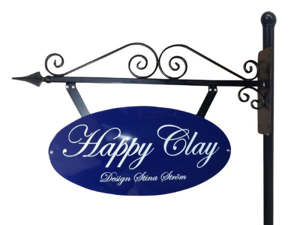 Smidesskylt med emaljskylt i gammaldags stil på stolpe 240cm.