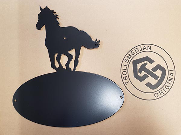 Väggskylt oval med motiv av en galopperande häst. Oval 300×150 (300×350)