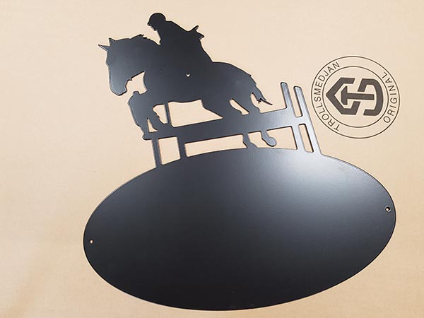 Väggskylt oval med motiv av en Hoppryttare. Oval 500×250 (500×530)
